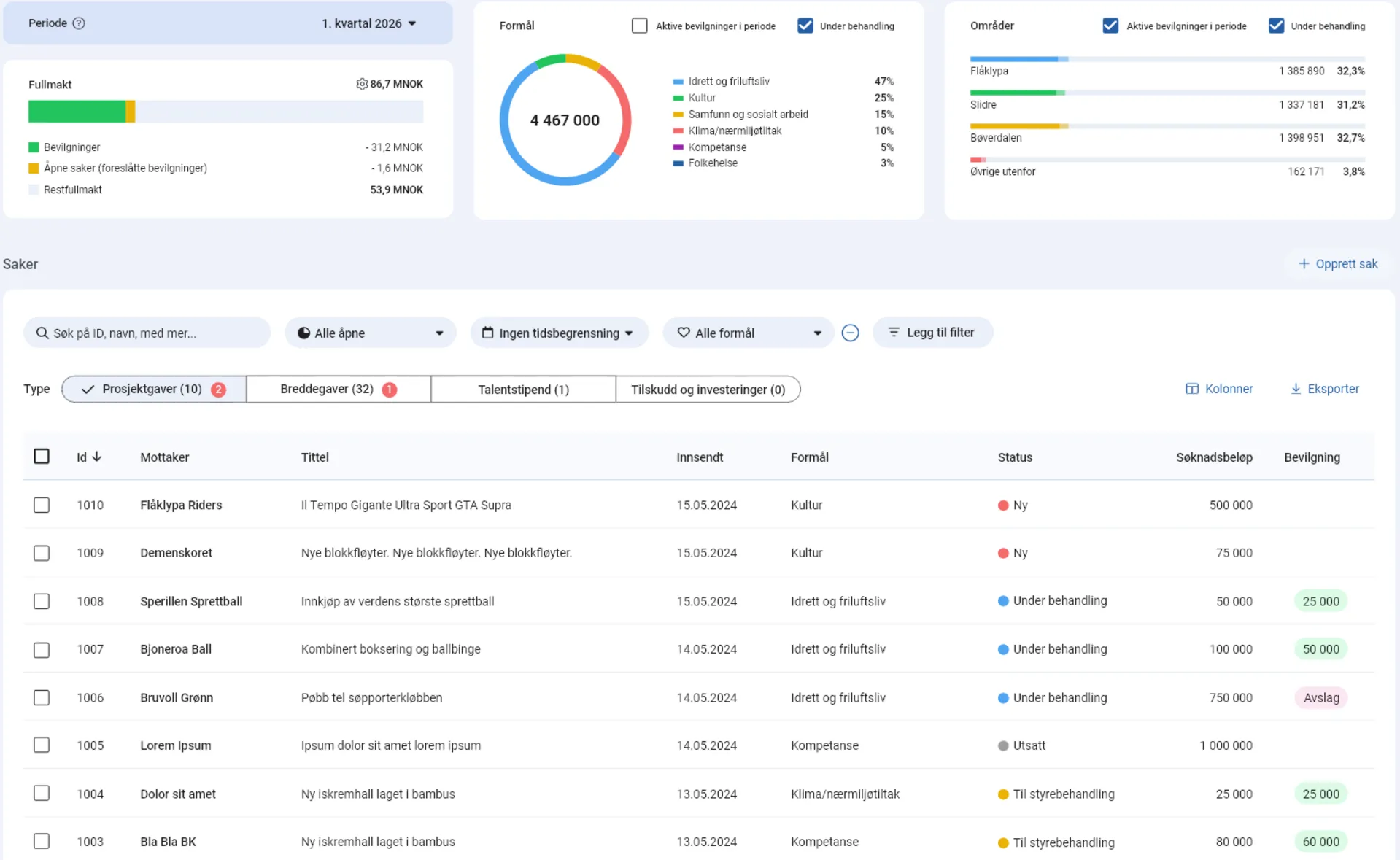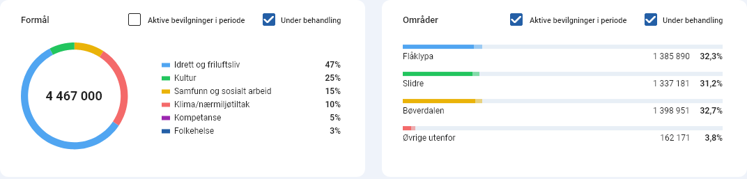 Dette gir dere rask og enkel oversikt over sakene dere jobber med, inkludert summeringer og fordeling på formål og områder. Områdevelgeren er som standard satt til kommuner, men kan tilpasses noe per stiftelse. Ta gjerne kontakt dersom dere ønsker en gjennomgang eller en prat om tilpasninger.