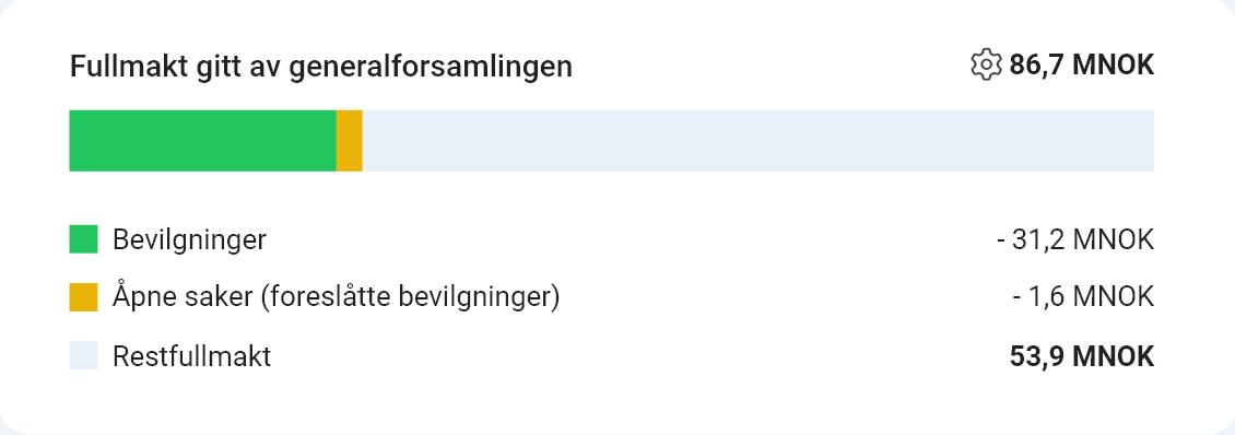 Til slutt har vi introdusert en ny widget som gir oversikt over hvor mye som er gitt opp mot eventuell fullmakt fra GF eller budsjett som er satt.